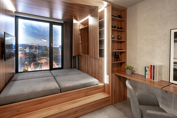 Od okna zaczęło się również projektowanie wnętrz mikroapartamentów. Pierwszoplanową rolę pełni stojące pod oknem łóżko, które w razie potrzeby można zamienić w kanapę. Rozkładane jest także biurko. To bardzo użyteczne rozwiązania, które oszczędzają miejsce. – Projektując mikroapartamenty, przede wszystkim pracujemy nad tym, aby wnętrze było jak najbardziej mobilne – zaznacza Artur Szczepaniak. – Poza tym trzeba je dostosować do przyszłych najemców. Legnicka 60C znajduje się na obszarze biurowym, więc aranżacja i wyposażenie lokali muszą być dostosowane do potrzeb wymagających osób – wyjaśnia.