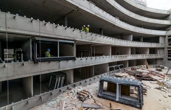 Na zaawansowanym etapie są roboty murarskie na wyższych kondygnacjach. Zakończyły się na piętrach hotelowych – pierwszym i drugim – a także na biurowym – trzecim. Z kolei na piętrze czwartym, gdzie znajdą się apartamenty, ściany działowe są gotowe w 80 proc. Na piątym i szóstym – odpowiednio w 50 i 40 proc.