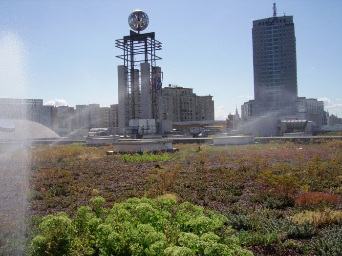 MP: Rośliny swoją drogą, ale największy problem stanowi tutaj drożność całego systemu, a właściwie jej brak. Specjalny skład substratu jest dobierany w taki sposób, żeby proporcje między kruszywami, piaskiem i częścią organiczną były odpowiednie i żeby wyeliminować z niego substancje ilaste, które zaklejają drenaż. Chodzi o to, żeby woda, którą podlewamy, albo która spada na dach podczas deszczu, mogła swobodnie spływać. Zielony dach to coś w rodzaju wanny, której dno wyłożone jest nieprzepuszczalną papą. Jeśli użyjemy nieodpowiedniego substratu, zapycha się system drenujący i woda w tej wannie stoi. Po kilku cyklach opadowych – to nie następuje bowiem od razu – drenaż jest już kompletnie zatkany. Zdarzają się sytuacje, że stagnująca woda opadowa przesiąka do wnętrza budynku, albo zalewa chodniki. Takie są właśnie skutki tej błędnie pojmowanej oszczędności.