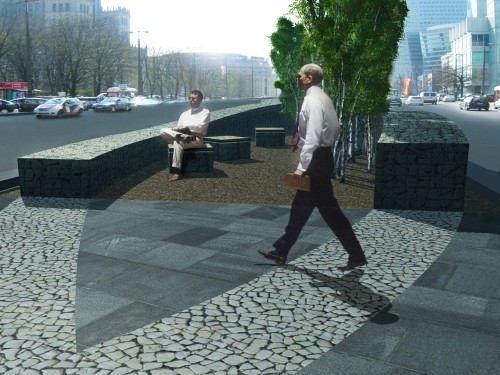 Wzór całości ułożony został z dwóch skrajnych materiałów: roślinnego, czyli zielonej wstęgi brzozowego zagajnika, oraz mineralnego, który będą stanowiły metalowe siatki (gabiony), również wypełnione materiałem kamiennym z odzysku. Wysokość tych konstrukcji - od 50 do 100 cm - nie stanowi przeszkody dla wzroku prowadzących pojazdy oraz pieszych. Stanowi jednak barierę przestrzenną dla osób przekraczających jezdnię w miejscach do tego niewyznaczonych. Taki sposób aranżacji ma zapewnić bezpieczne użytkowanie całości ulicy Emilii Plater. W miejscach przejść dla pieszych – przy brzozach – będą elementy małej architektury, takie jak ławki na gabionach oraz pojedyncze siedziska (taborety!). Dzięki temu w tym ruchliwym miejscu będzie można odpocząć wśród zieleni.