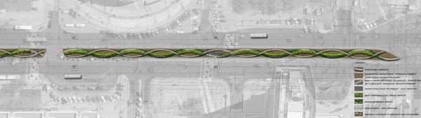 **Jak się buduje DNA ulicy?**Nową kompozycję ulicy tworzy para przeplatających się ze sobą linii, inspirowanych łańcuchem DNA. Wykonane są one ze stykających się ze sobą gabionów kamiennych.
