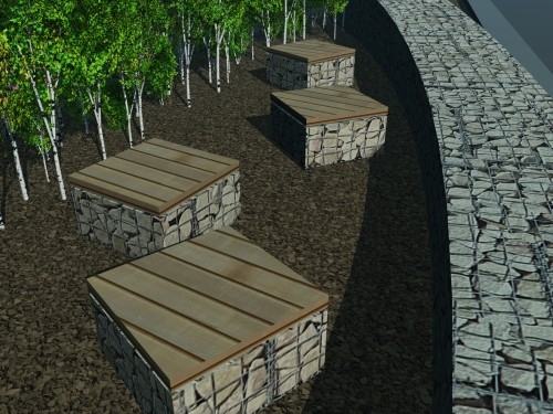 Miejsca przecięcia się dwóch linii gabionów zaakcentowane będą pnączami. Gatunki zasadzone przy gabionach, po krótkim czasie pokryją je, tworząc miejski melanż: kamienia naturalnego, stali i tworzywa roślinnego.