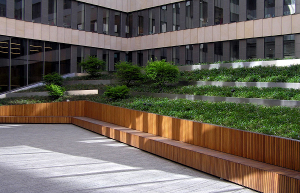 - Koordynacja, elastyczność i świeże spojrzenie to podstawa przy takim projekcie. Koordynowaliśmy działania z innymi ekipami podwykonawców. To pozwoliło na płynną i efektywną pracę nad wystrojem otoczenia budynku. Elastyczność powoduje, że tak jak w przypadku kaskady wprowadzamy korekty sposobu montażu i kształtu elementów w trakcie realizacji i osiągamy jeszcze lepszy efekt wizualny. Nowe spojrzenie pozwala nam, tak jak w przypadku ławek, opracować specjalną technologię montażu elementów z drewna egzotycznego iroko i wiązowca z częściami ze stali nierdzewnej – mówi Mariusz Pasek z Ogrodowni.