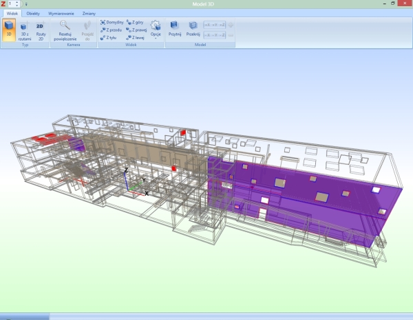 Widok modelu ze zmianami – na czerwono elementy usunięte, fioletowo elementy zmodyfikowane.