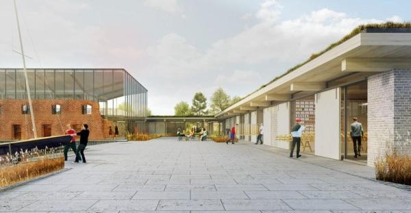 Cała zaprojektowana zabudowa przyjmuje rozległą horyzontalną formę i w swojej prostej konstrukcji odwołuje się do charakteru dawnych suszarni cegieł. System dziedzińców wyznacza strefy ogólnodostępne – reprezentacyjne oraz niezbędne zaplecza. Ruiny cegielni z wysokim ceglanym kominem są sercem kompleksu, a jednocześnie dominującym elementem przestrzennym.