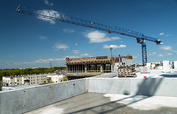 Dla utrzymania dobrego tempa prac Totalbud, jako generalny wykonawca, zwiększył liczbę dźwigów z planowanych dwóch do trzech. Część dźwigów jest zamontowana na kotwach w szachtach windowych, aby nie wkraczać na teren miejski oraz żeby zoptymalizować zasięg ich pracy.