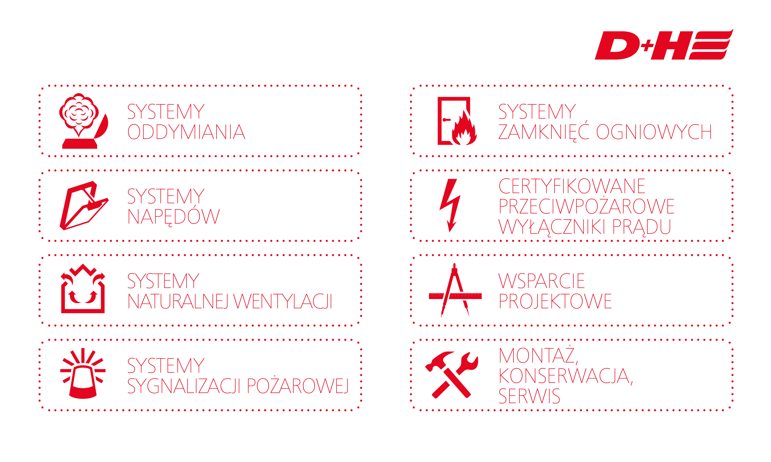 Oferta D+H Polska obejmuje systemy oddymiania, systemy napędów, naturalnej wentylacji, wentylacji pożarowej, zamknięć ppoż. oraz systemy sygnalizacji pożarowej i certyfikowane przeciwpożarowe wyłączniki prądu. Urządzenia i produkty, które wchodzą w skład poszczególnych systemów odznaczają się najwyższą jakością – są zgodne z obowiązującymi normami i przepisami ppoż., posiadają certyfikaty CNBOP. Nasza działalność nie ogranicza się jednak do samej sprzedaży. Zapewniamy kompleksowe wsparcie na każdym etapie realizacji inwestycji – od projektu przez dobór i dostawę urządzeń aż po ich instalację i uruchomienie systemu.